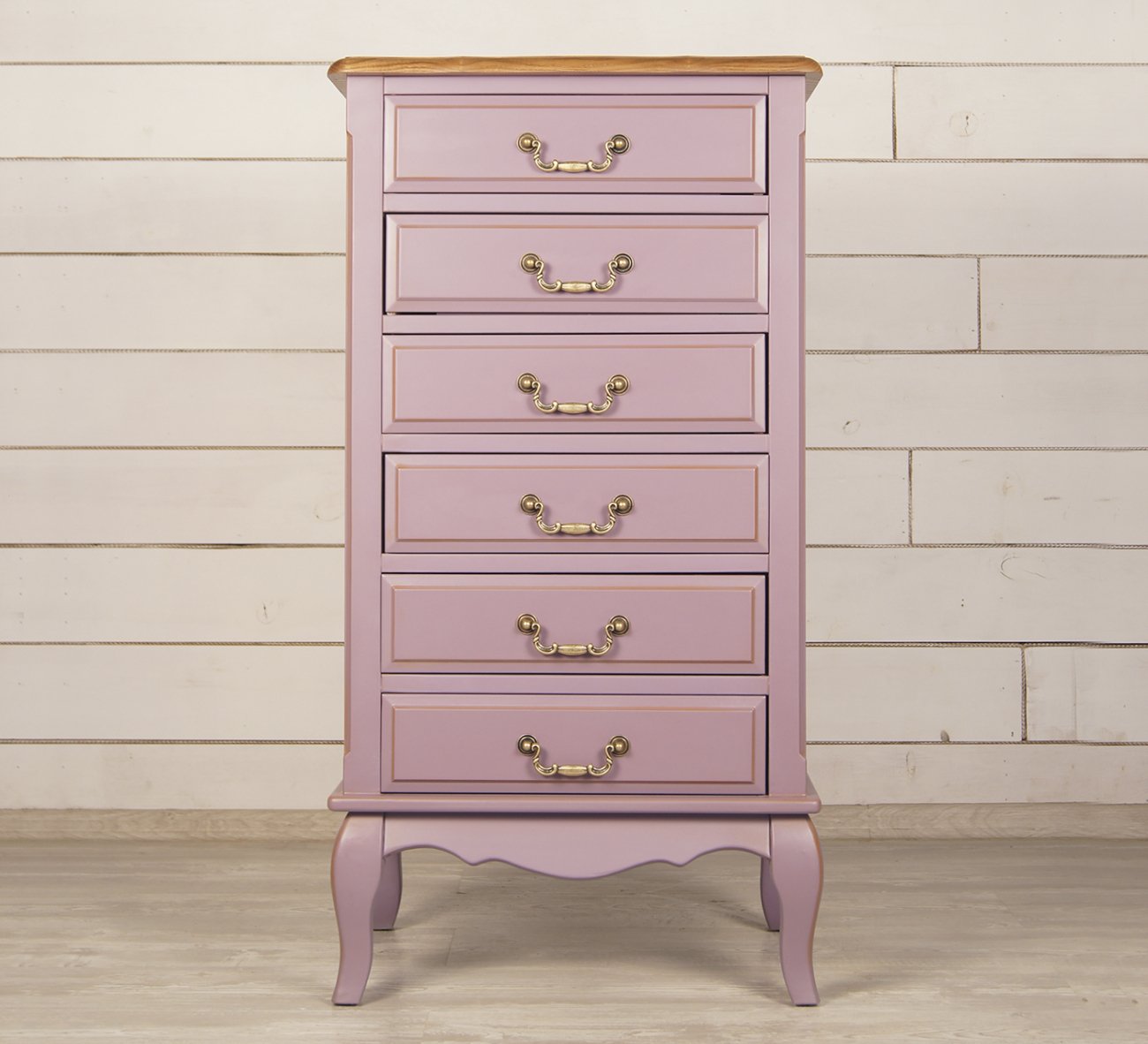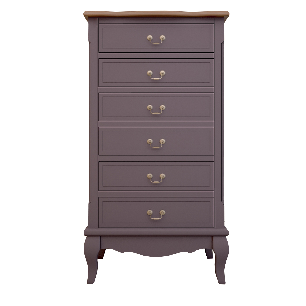 Цвет: Лавандовый,Глубина, см: 40,Высота, см: 100,Ширина, см: 53,Материал: Массив березы,Вес: 23 кг,Размер: Маленькие,Стиль: Прованс,Особенности: Столешница - ясень,Форма: Прямоугольные,Цвет столешницы: Кофе с молоком,Дизайн: Франция,Вид: Высокие,Ориентация: Вертикальная,Назначение: Для белья,Количество ящиков: 6,Ножки: с гнутыми ножками,Опора: На ножках, Комод Leontina lavanda на 6 ящиков лавандовый